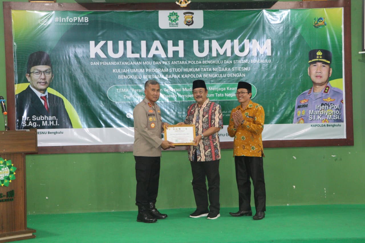TBnews, Bengkulu – Kapolda Bengkulu Irjen Pol. Mardiyono, S.I.K., M.Si. menghadiri kegiatan sosialisasi kuliah umum yang dirangkaikan dengan penandatanganan Nota Kesepahaman (MoU) dan Perjanjian Kerja Sama (PKS) antara Polda Bengkulu dan Sekolah Tinggi Ilmu Ekonomi Syariah Nahdlatul Ulama (STIES NU) Bengkulu, Rabu (28/1/2026) pagi.
