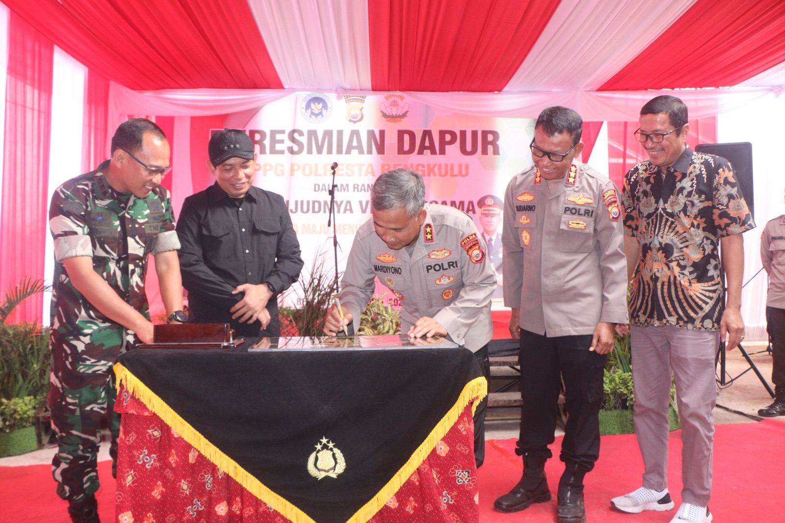 Bengkulu, 11 Juli 2025 – Kapolda Bengkulu, Irjen Pol Mardiyono,S.I.K ., M.Si., meresmikan Dapur Satuan Pelayanan Pemenuhan Gizi (SPPG) Kota Bengkulu di Jalan Regional 9A/B, Pekan Sabtu, Kecamatan Selebar, Kota Bengkulu, Jumat (11/7/2025). Peresmian ini ditandai dengan penandatanganan prasasti oleh Kapolda Bengkulu dan pemotongan pita oleh Wali Kota Bengkulu.