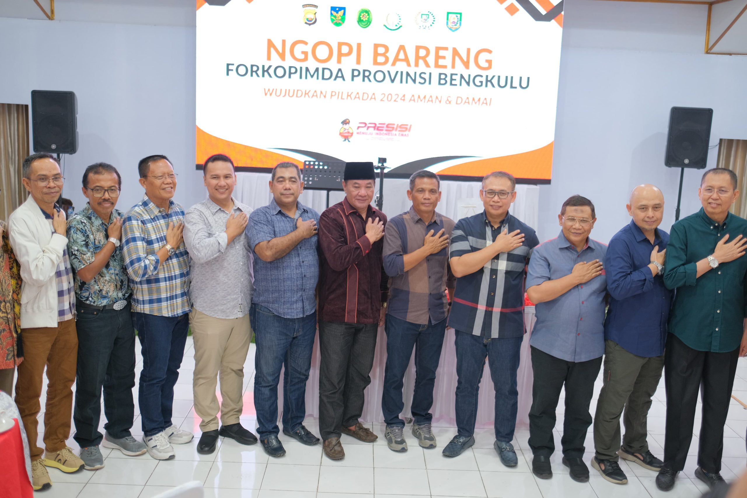 Kegiatan yang bertema “Mari kita bersinergi menciptakan situasi keamanan untuk mewujudkan Pilkada 2024 berintegritas” dihadiri PLT Gubernur Bengkulu Dr. H. Rosjonsyah Syahili Sibarani, S. Sos, M. Si, Ketua DPRD Provinsi Bengkulu, Danrem 041/Gamas yang Diwakili oleh Kasrem, Kajati, Ketua Pengadilan Tinggi Bengkulu, Kabinda, PLT. Kasatgaswil Densus 88, Danlanal, Ketua KPU Provinsi Bengkulu, Ketua Bawaslu Provinsi Bengkulu, Sekda Provinsi Bengkulu, Ketua MUI Bengkulu, Ketua BMA Provinsi Bengkulu, Kaban Kesbangpol Provinsi Bengkulu, Kasatpol PP, Ketua PWI, Ketua SMSI, Ketua JMSI, Ketua KPID, Ketua Amsi, dan pejabat utama Polda Bengkulu serta lapisan insan pers.