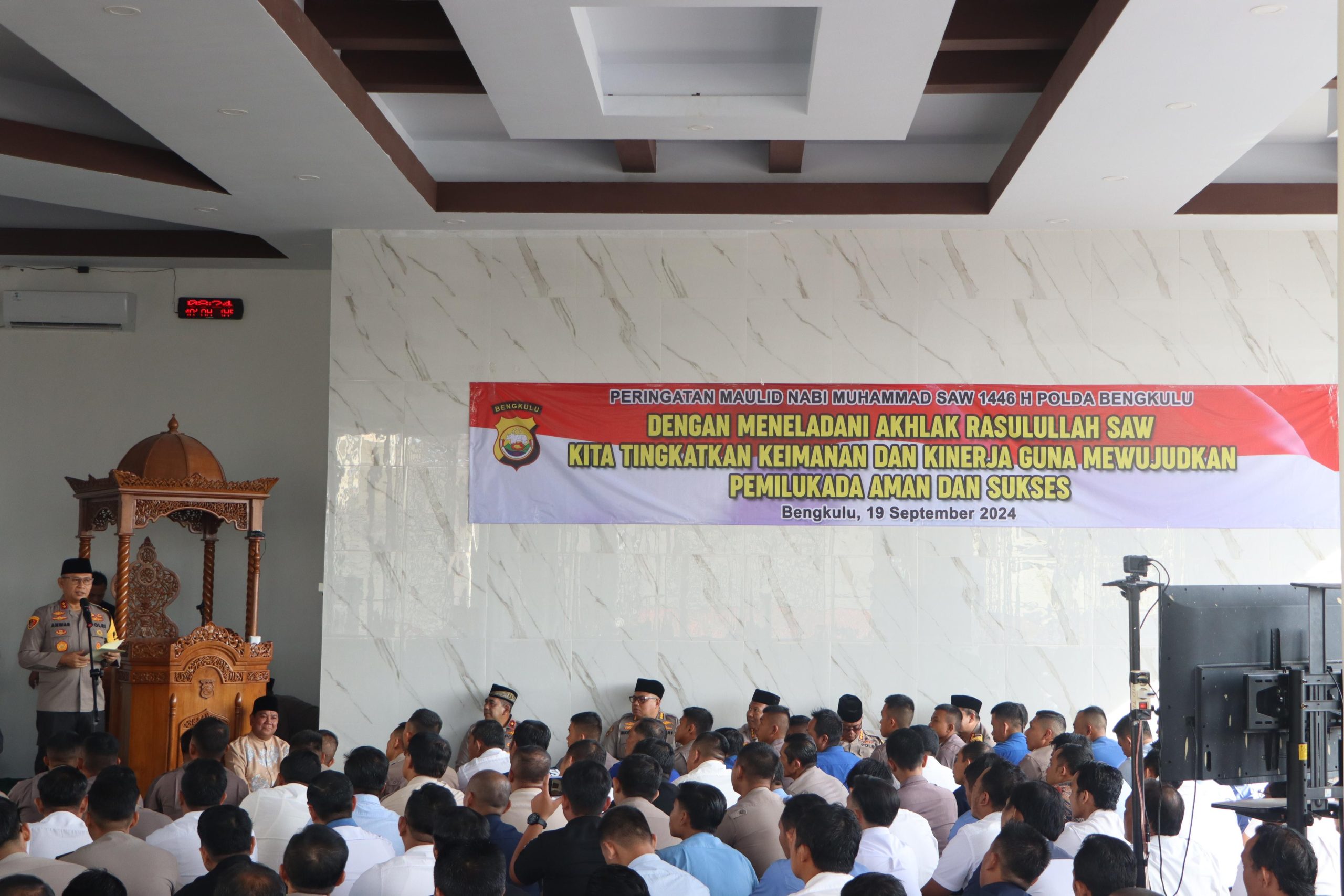 TBNews, BENGKULU – Polda Bengkulu hari ini melaksanakan kegiatan peringati Maulid Nabi Besar Muhammad SAW 1446 Hijriyah yang berlangsung di Masjid Al-Amin Polda Bengkulu. Kamis, 19 September 2024.